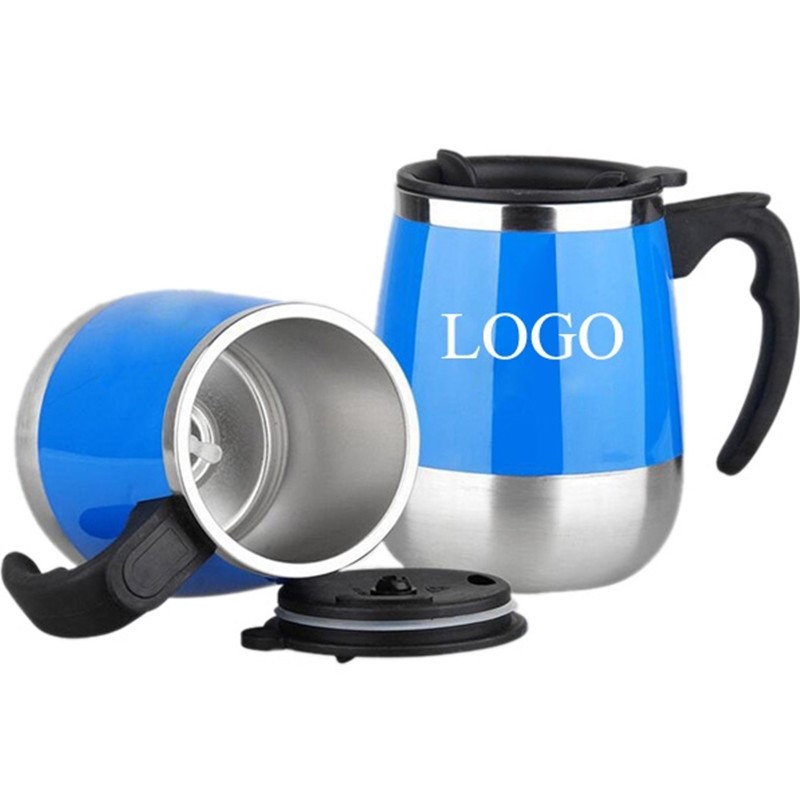 This mug is made of stainless steel and food-grade polypropylene material. It can mix tea or coffee automatically when the hidden button on the handle is pressed. Two AAA batteries are required for use and are not included. Great for the office, car, travel, home and more, it features temperature preservation as well. Add your brand to this self-stirring stainless steel mug to lend a helping hand while promoting your company!