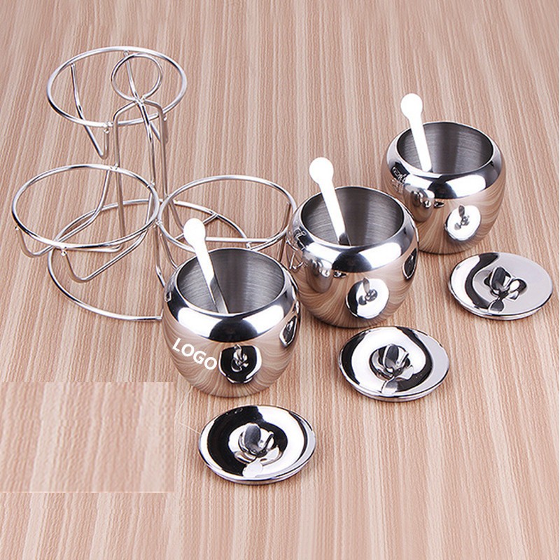 Excellent kitchen tool! This 304 stainless steel seasoning jar set is perfect for storing and serving salt, sugar, chili, pepper and son on. The set includes 3 seasoning jar, 3 spoons and a shelf. A beautiful set will be very eye-catching on your kitchen surface or table. This jar measures about 4” tall and 3 1/2” diameter and has a lift-off lid. It is really a promotional giveaway for your business.