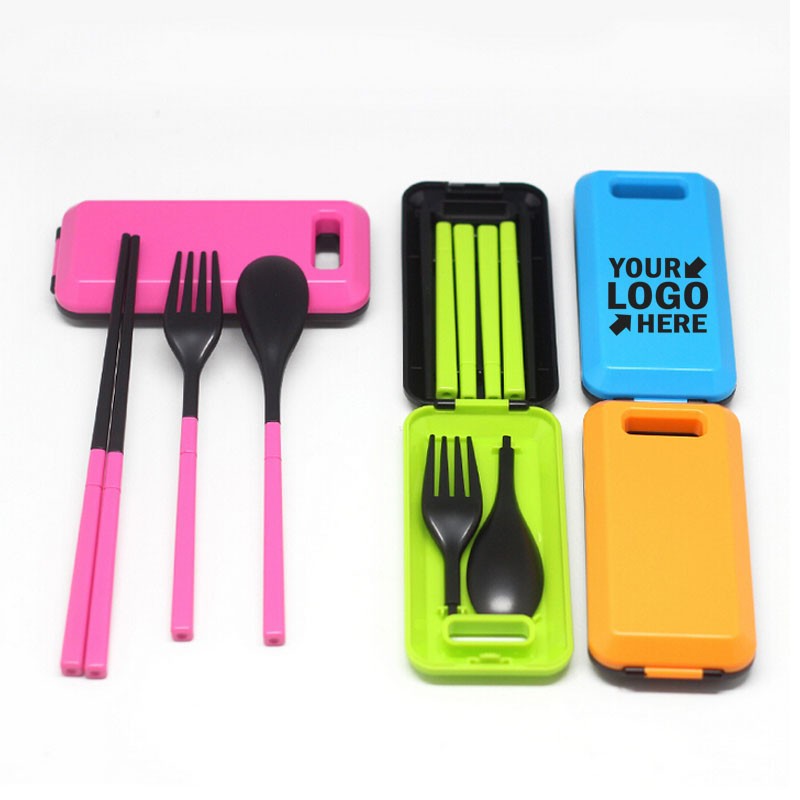There are a pair of chopsticks, a fork and spoon, that' great to eat noodle, cake, rice, vegetable and different kinds of food. Made of Eco-friendly ABS, spoon & fork: 6 3/4", chopsticks:7 1/2". This set can be customized with an imprint of your company name and logo for maximum brand exposure. Feel free to contact me about the logo!