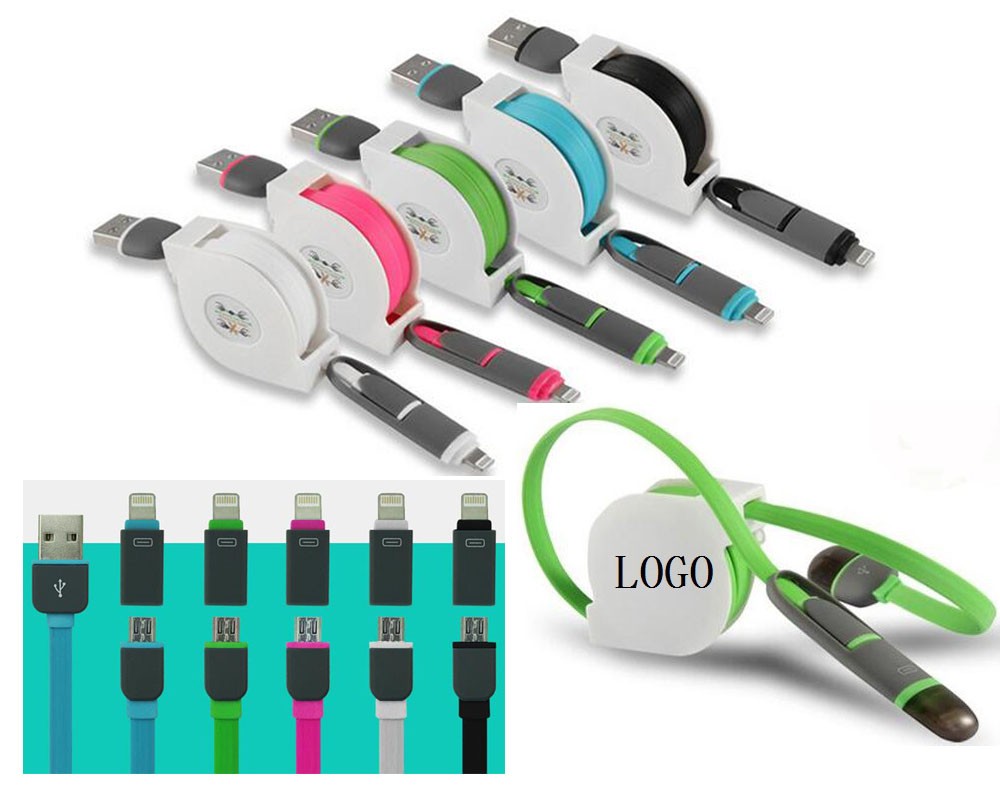 2 in 1 data sync cable compatible with iOS and Android for charging and data transfer. Flat and retractable cable design that prevents the cable from tangles and lasts longer. Custom logo is welcom