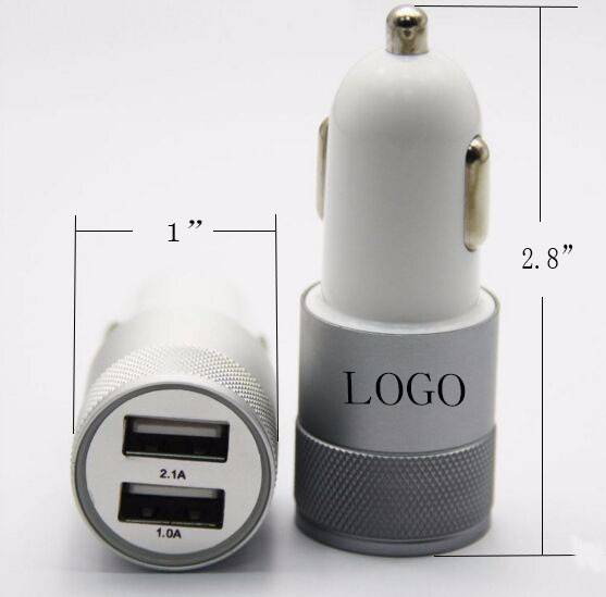 This car charger is made of aluminium alloy & ABS. It is compact and convenient. It can charge up 2 devices at the same time. Its size is 2.8" x 1" and imprint size is 0.7" x 1".