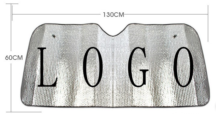 Car sun shade is made of aluminium foil. It can be used for sunscreen in summer and snow defence in winter. Its size is 51" x 23.6" and imprint size is 50" x 20". Customized imprinting is availiable.