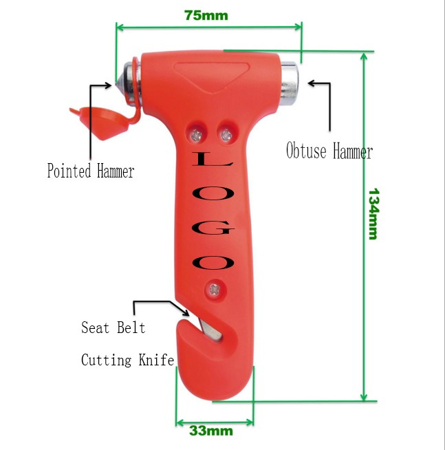 Emergency hammer is made of ABS & carbon steel. It is designed to help drivers escape from their vehicles in emergency. We can use it to cut off seat belt and scrap window in the car. Its size is 5.3" x 3" x 1" and imprint size is 2" x 1".