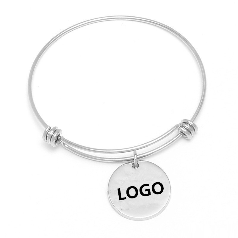 This adjustable silver bangle is made of high quality titanium steel. Designed in C-shaped opening, it is a fashionable jewelry and suitable for unisex group especially for women. With 1” blank charm, you could add your logos and slogans by laser engraving. This bracelet is a perfect souvenir accessory for wedding, jewelry store and other promotional events.