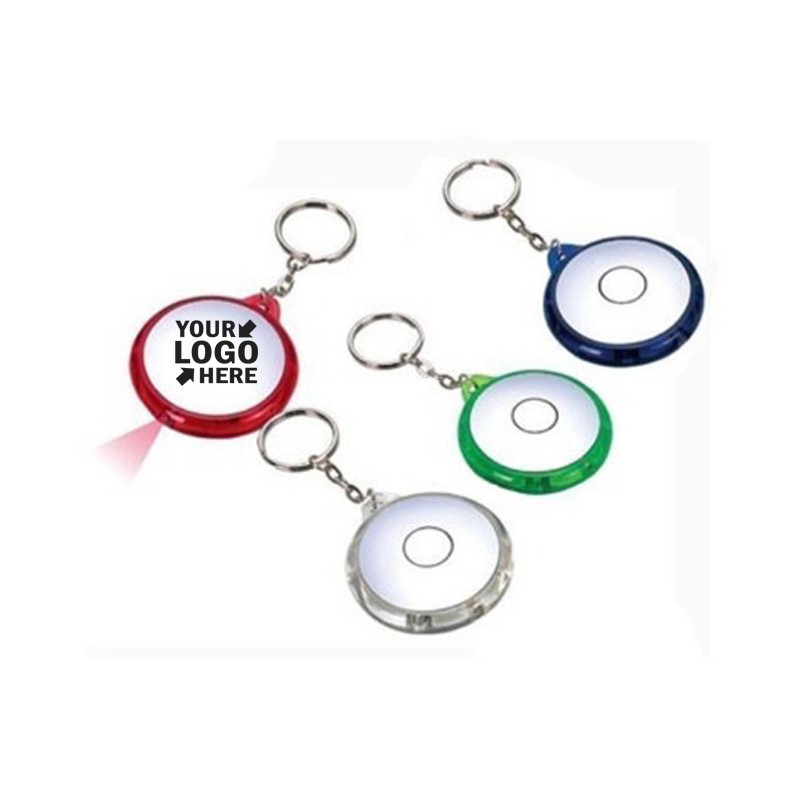 The small round flashlight comes in a variety of colors with stylish silver trim and looks even better with an imprint of your logo or advertising message. This key chain features a single bright LED bulb that turns on with the push of the very large button. It's a promotional item that's sure to help your brand name get around. Feel free to contact us about the logo !