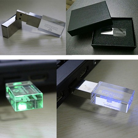This LED crystal flash drive is made of crystal and metal,capacity is 1GB,size is 2.36"x0.78",with imprint size 0.39"*0.98".The LED light could be red,blue,green,white.The imprint method is laser engraving,with gift box packing,looks more refined,help to built a higher level corporate image. Customized logo is welcome.